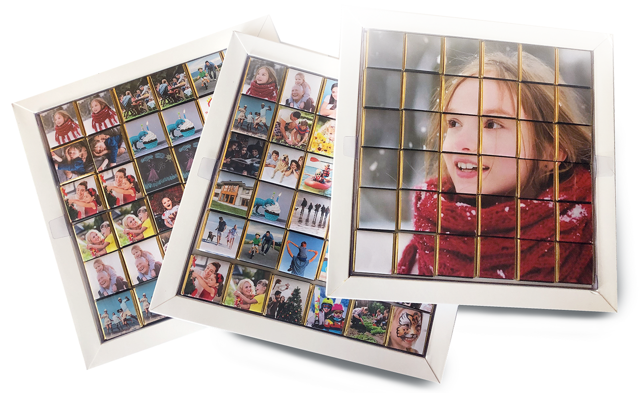 | Puzzle aus Schokolade Die Überraschung ist perfekt. Schokolade-Memory mit 18 Bildpaaren – spielen und essen. Die Familie, die Fussballmannschaft, die Firma – alles hat Platz auf 36 einzelnen Fotos. |